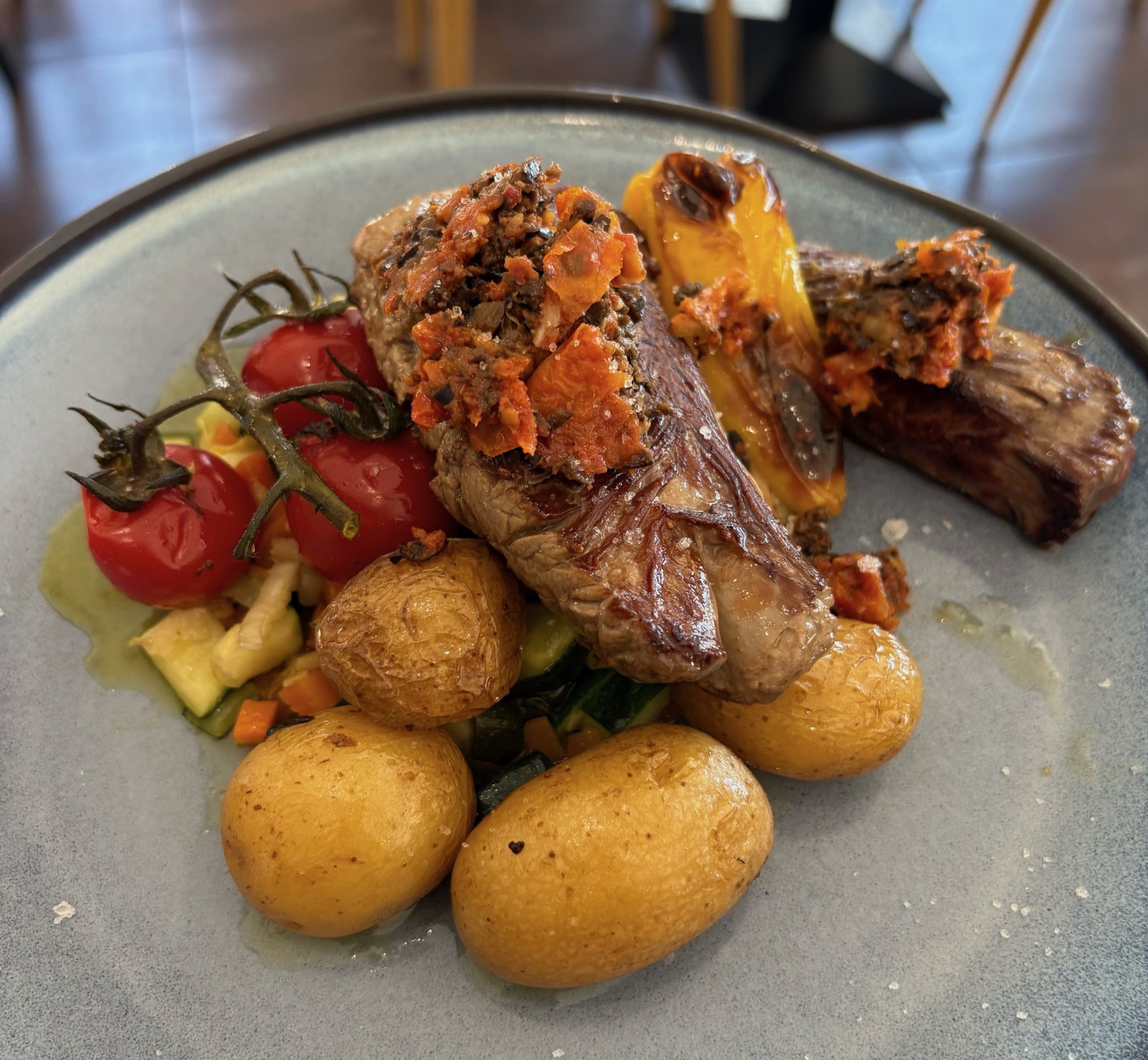 Onglet de Veau Grillé, condiments olives et tomates, grenaille et légumes