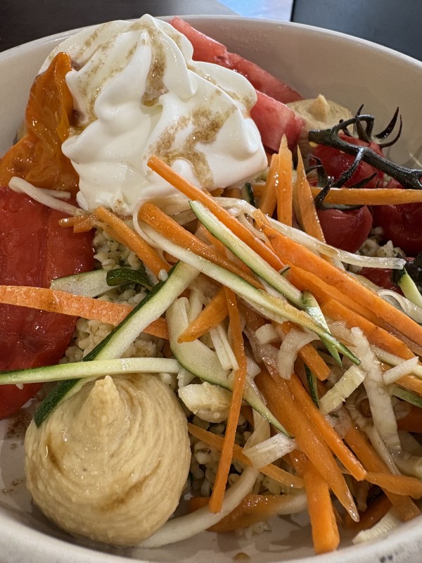 Le poke végétarien met en avant des céréales, des légumes crus et cuits du moment, ainsi qu’un effiloché de pois chiche.